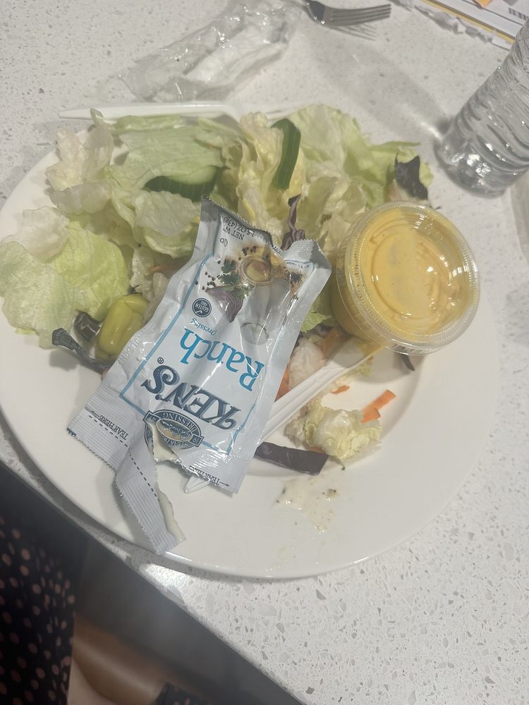 A toss of romaine lettuce, corn, black beans, avocado, cucumber and tomato served with ranch dressing.